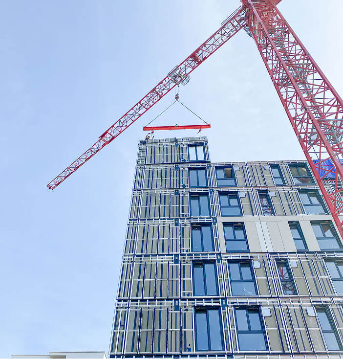 Bei Koblenz steht das erste Hochhaus von GROPYUS. Dank industrieller Vorfertigung dauerte die Montage je Geschoss aus 69 Elementen nur eine Woche.